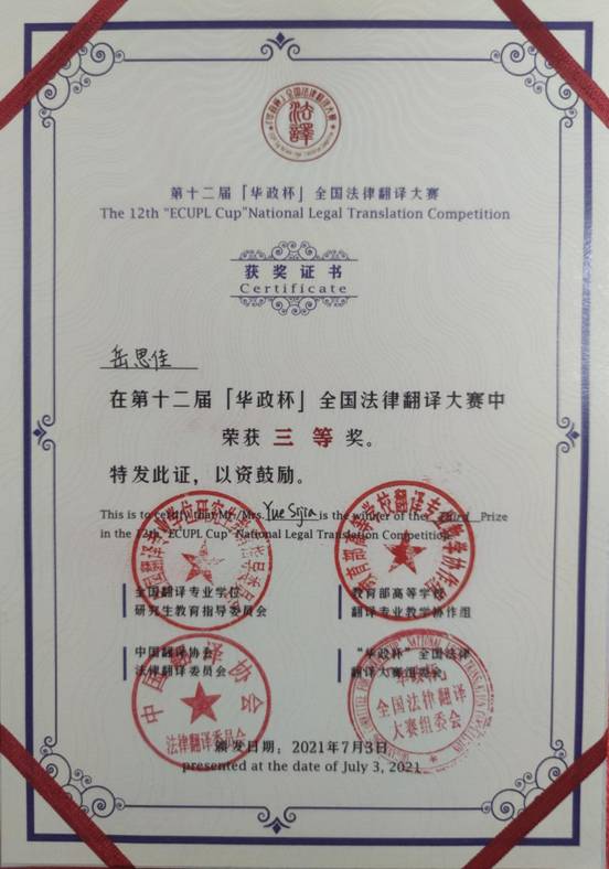 法律翻译大赛是一项法学界、外语界及法律翻译业界共同参与的标杆赛事,在全国具有一定影响力,法学翻译不仅是沟通中西法律世界的桥梁,也已成为推动我国法制现代化的纽带。比赛前期,学院选拔组成法律英语竞赛后备团,指导教师孙佳颖和辅导员李慧组织鼓励学生积极参赛,并进行有针对性的辅导。今后,学院将进一步凝练学科专业特色,积极推进“新文科”建设,切实提高人才培养质量,回应国家和社会所需。